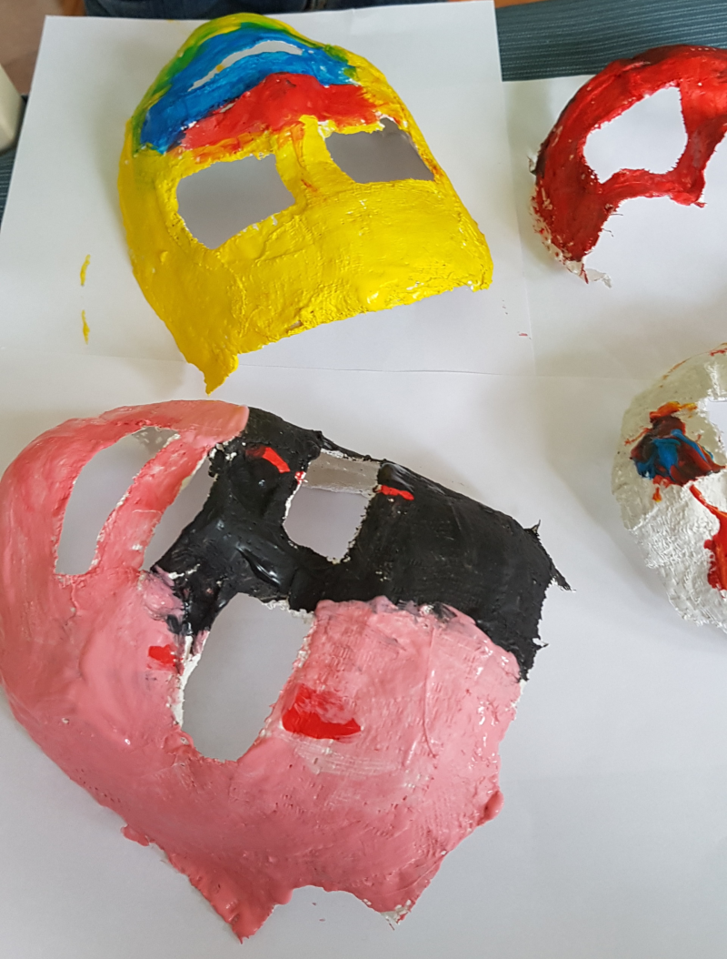 Toen de maskers droog waren hebben we de kinderen het laten versieren. We hadden bedacht het met stukjes papier te doen, zoals een soort papier dat gebruikt wordt om glas in te pakken. Dit heb je ook in kleurtjes. Maar de kinderen wilden graag verven. Dus dit was ook goed! Erna nog wat diamantjes en glitters eroverheen en ze waren helemaal in hun nopjes!
